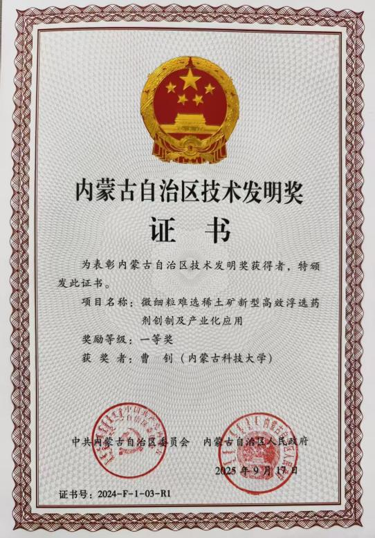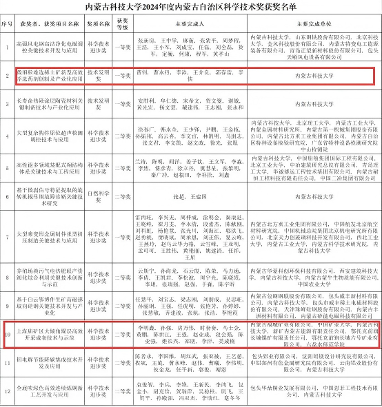 11月27日,2024年度内蒙古自治区科学技术奖励大会在呼和浩特市召开,表彰为全区科技进步和高质量发展作出突出贡献的科技工作者。大会公布了2024年度自治区科学技术奖获奖名单,BBIN宝盈集团官方网站员工参与的多项成果荣获自治区科学技术奖,曹钊教授团队的“微细粒难选稀土矿新型高效浮选药剂创制及产业化应用”获得技术发明奖一等奖,段会强老师参与“上海庙矿区大倾角煤层高效开采成套技术与示范”获得科学技术进步二等奖。